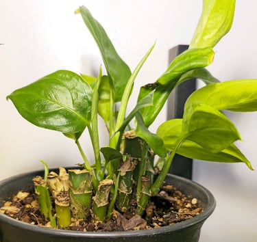 Symptoms of Exposure: Dieffenbachia sap contains calcium oxalate crystals, which can cause a range of irritating symptoms if it comes into contact with skin, eyes, or is ingested. When the sap touches the skin, it can cause redness, itching, and a burning sensation. It's best to wear gloves when handling the plant to avoid skin irritation. If the sap gets into the eyes, it can cause pain, redness, and swelling. It's crucial to rinse the eyes immediately with plenty of water and seek medical attention if irritation persists. Chewing or swallowing parts of the Dieffenbachia plant can lead to intense burning and swelling of the mouth, tongue, and throat. This swelling can make it difficult to speak or swallow and, in severe cases, can affect breathing. This is why Dieffenbachia is sometimes called “Dumb Cane”—the swelling can temporarily impair speech, making it difficult for someone to talk. Inhaling dust from dried parts of the plant can cause respiratory irritation and discomfort. If someone comes into contact with Dieffenbachia sap, it's important to wash the affected area thoroughly with soap and water and to seek medical advice if symptoms are severe or persist. If pets chew Dieffenbachia, they may drool, vomit, or have mouth swelling and need veterinary assistance. Should your pet display any of these symptoms, or if they're ill and there's a chance they could have had access to a Dieffenbachia plant, it's always essential to tell your vet.